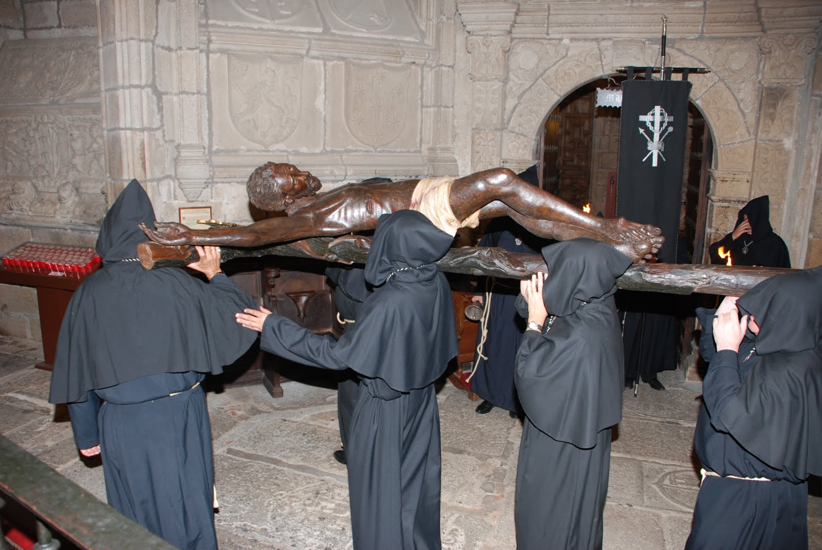 La muy Solemne Venerable y Pontificia Cofradía de la Hermandad Penitencial del santo Cristo de Santa María de Jesús , o popularmente llamado Cristo Negro, fué fundada en Portugal por los antiguos caballeros del templo y los de la orden de Alcántara sucesora de la de los Fatres de Cáceres, llamados ahora Pobres Caballeros de Cristo refugiados en Portugal, el día 3 de mayo de 1.490 y refundada en 1.986, procesióna los Miércoles santos a las 24,00 horas siendo de obligado el silencio, goza de muneros clasus, es decir que solo puede tener de entre 50 y 59 hermanos, en principio surgió como devoción particular de la nobleza, después pasaría a devoción popular, en su origen templario y los hermanos antes de posesionar y a puerta cerrada celebran los ritos de esta orden, la talla es anónima del siglo XIV.